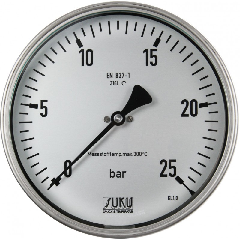 This bourdon tube pressure gauge in all stainless steel is designed for harsh conditions and to meet the stringent demands of pressure measurment in production plants of the chemical industry and in other comparable industrial sectors. It is useable at medium temperatures up to 300°C (572°F).