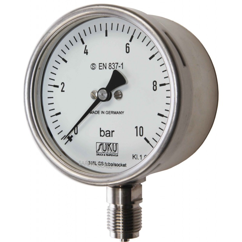 The safety version of the pressure gauge comprises a burst-proof solid front between bourdon tube and window, a laminated safety glass as well as a blow-out back (according to EN 837-1/S3).