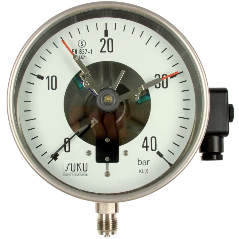 The safety version of the pressure gauge comprises a burst-proof solid front between bourdon tube and window, a laminated safety glass as well as a blow-out back (according to EN 837-1/S3).